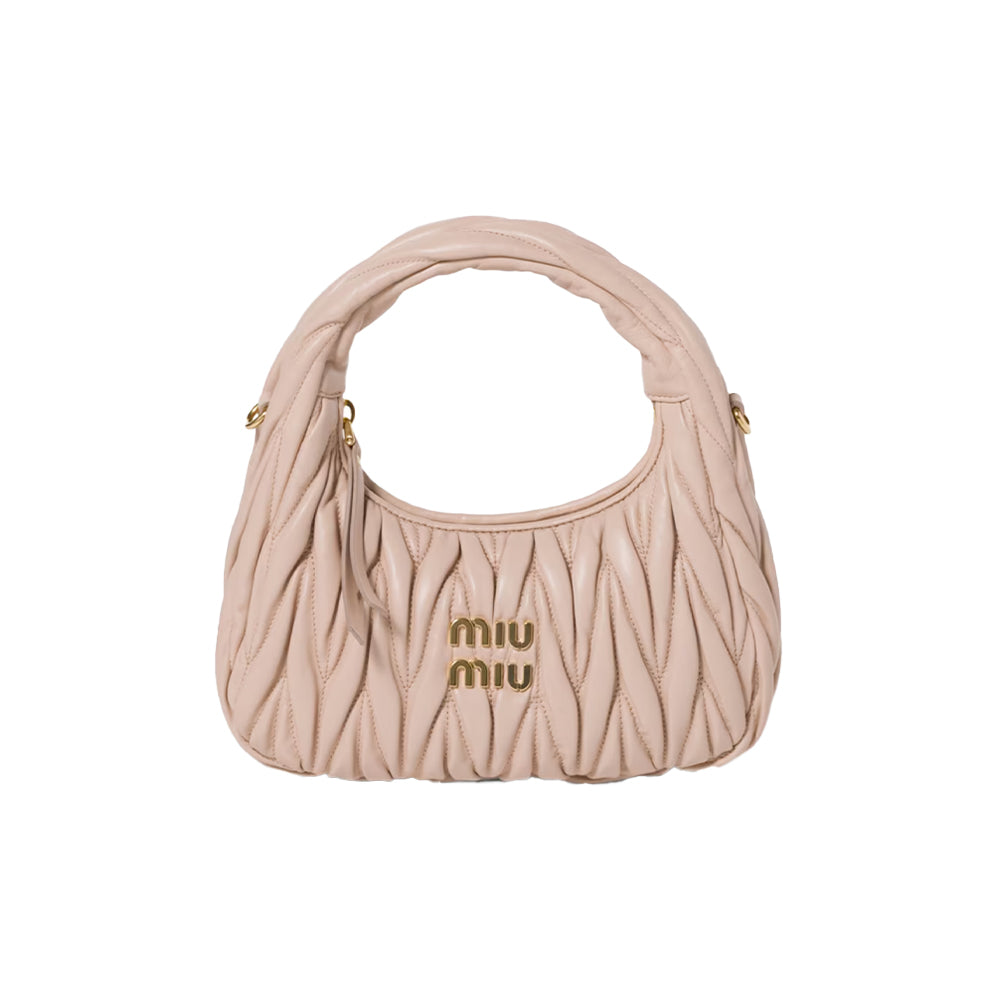 The Miu Miu Wander Bag in Powder Pink is a signature piece that seamlessly blends classic design with contemporary flair. Crafted from luxurious matelassé nappa leather, the bag showcases a sophisticated three-dimensional texture, enhancing its visual appeal. The hobo silhouette, inspired by retro aesthetics, is reimagined to embody modern femininity.